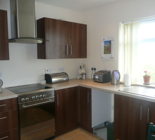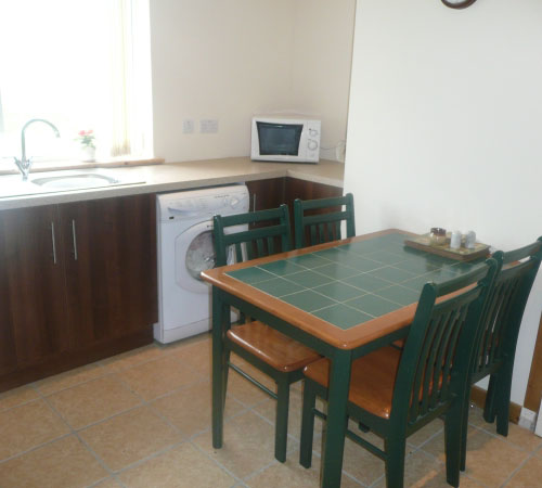 Modern fitted kitchen with stainless steel appliances and tiled floor. Includes microwave, fridge, washing machine. A separate larder fridge is located in the hall cupboard. Fully stocked kitchen including dining table and chairs, cutlery, glasses, plates, pans.