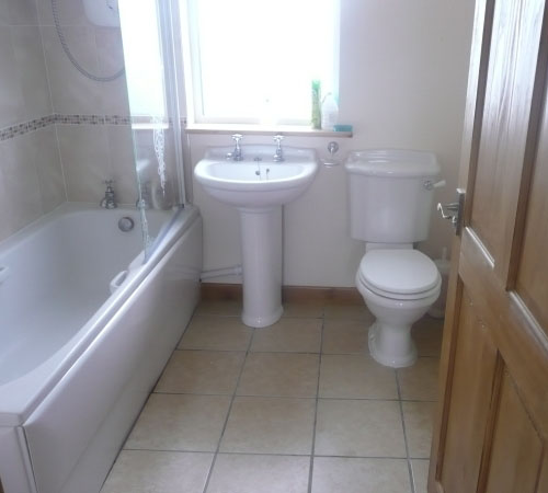 Modern fitted bathroom with a clean and bright feel. quality porcelien toiledt and matching washand basin. Electric shower over the bath with adjustable shower slider rail. Electric extractor fan. Tiled floor and walls. Heated towel rail. Large bathroom mirror